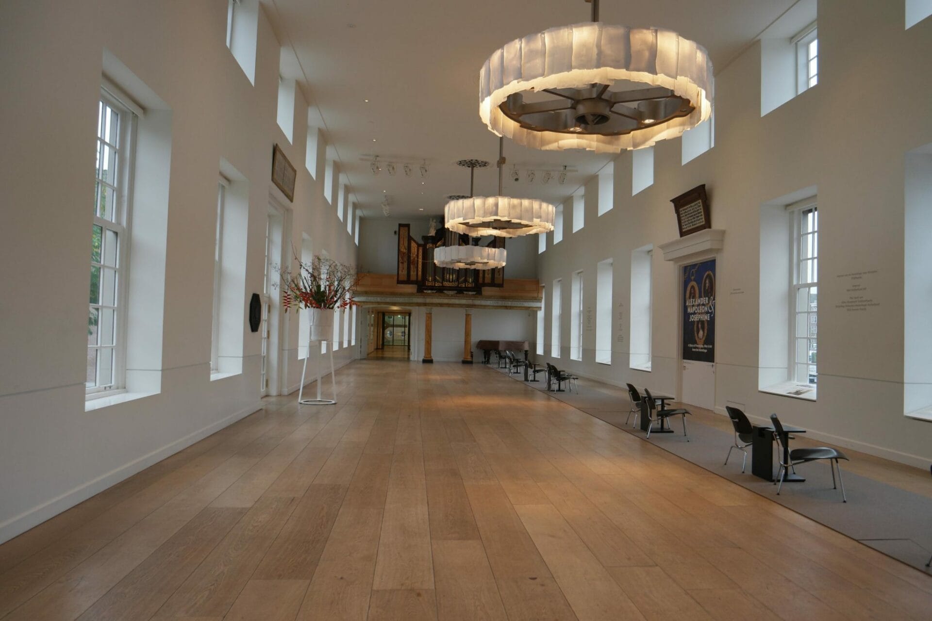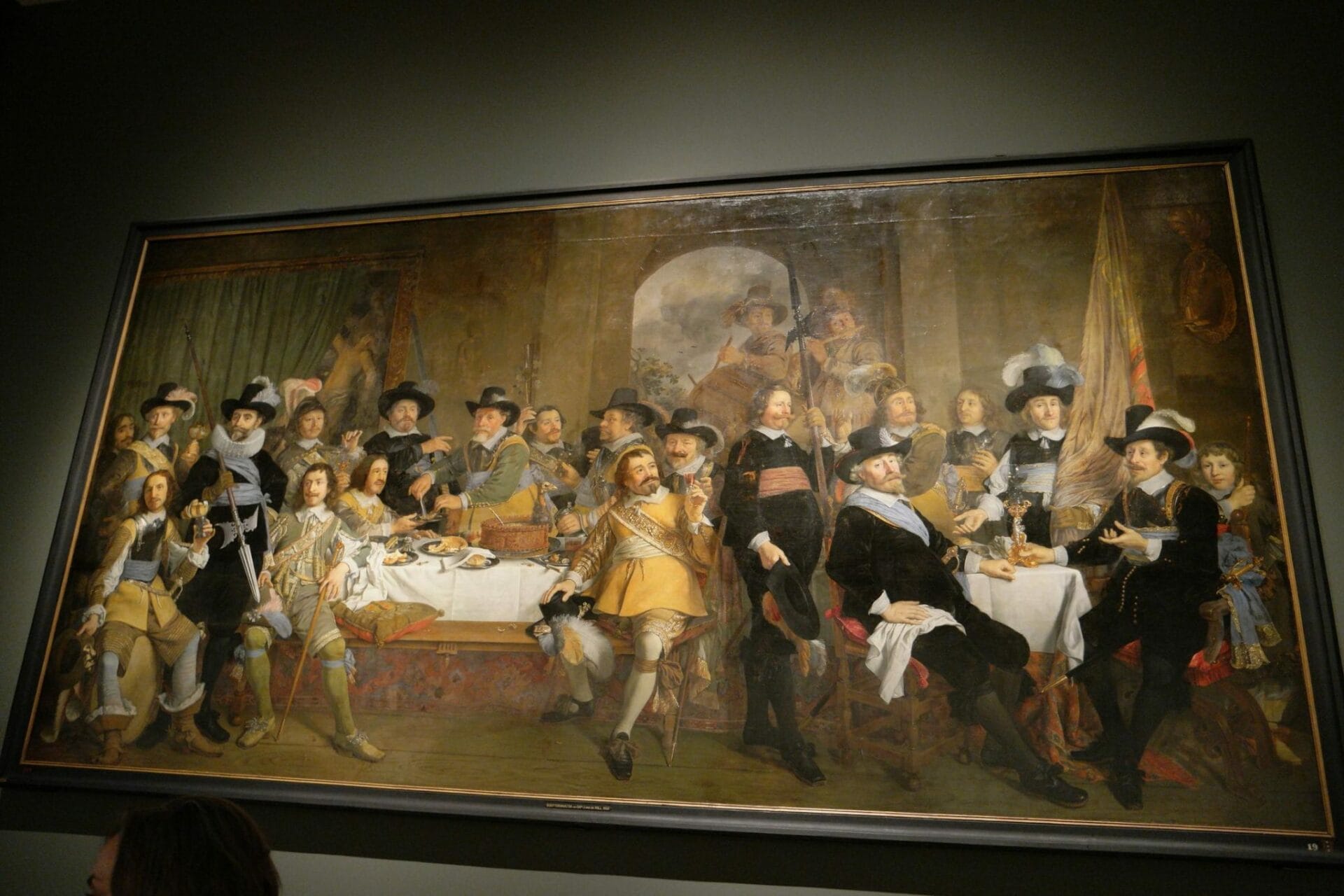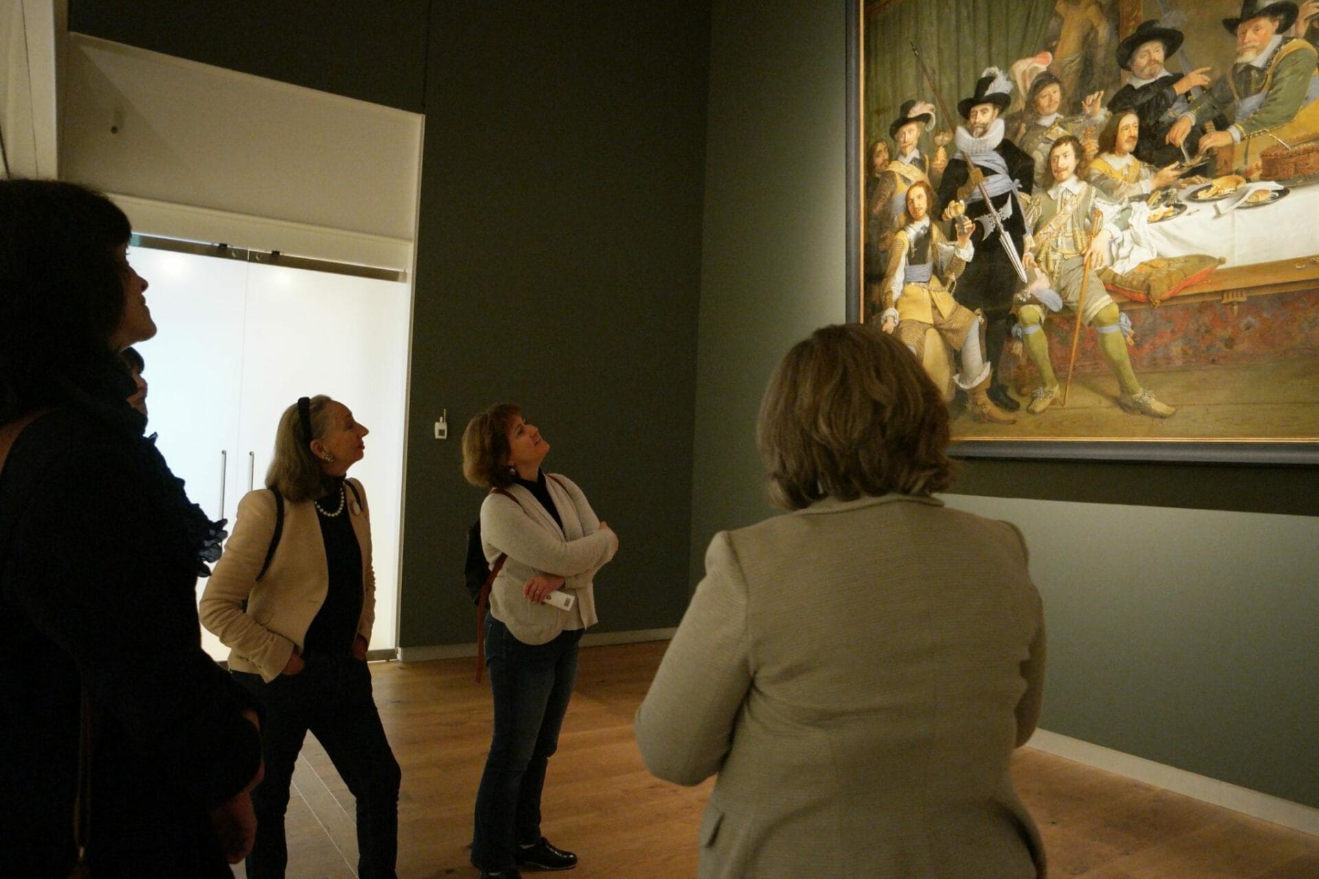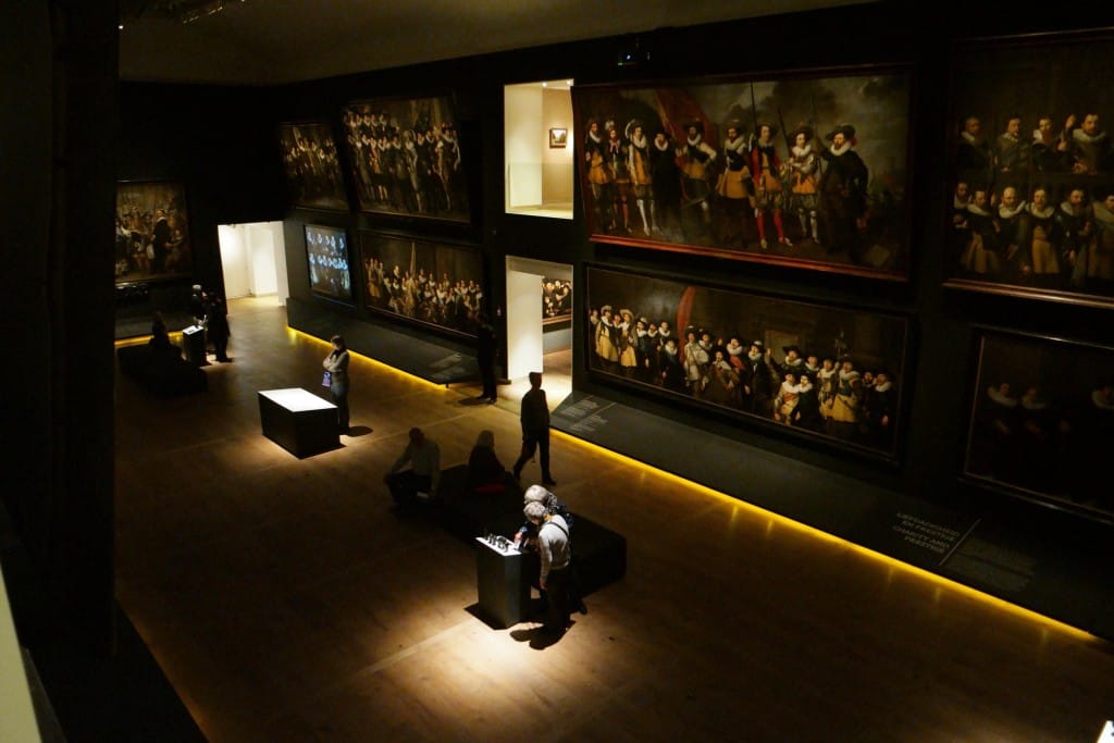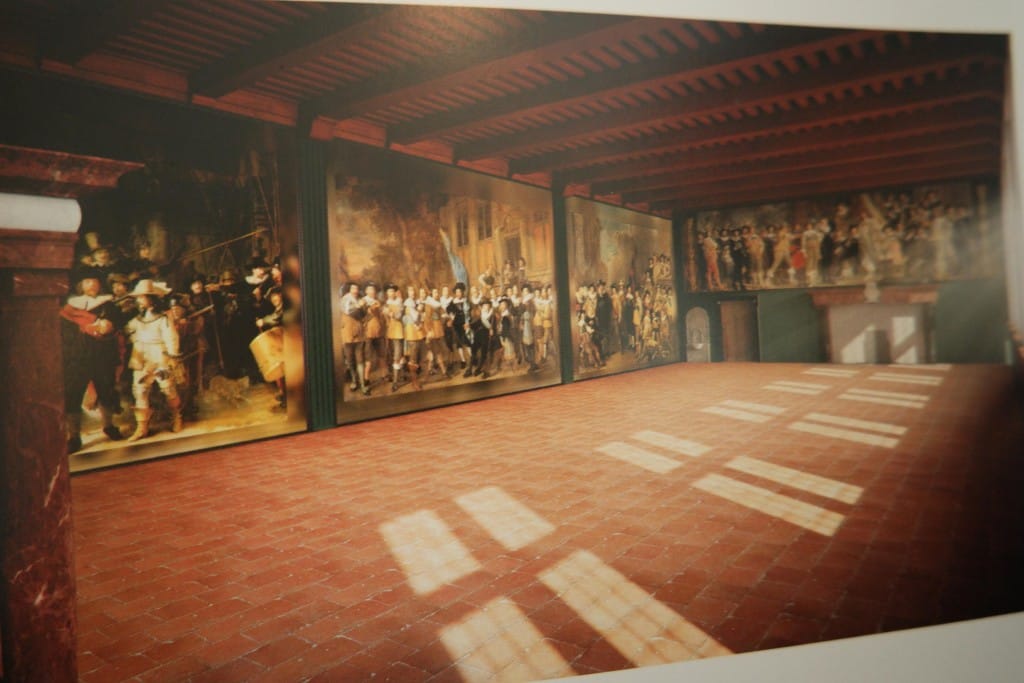 Pour situer le cadre auxquel ces tableaux étaient destinés, j’ajoute une photo d’ une salle du Doelen au 17éme siècle. Là se réunissait la compagnie des arquebusiers qui commandait ces grands tableaux. Sur cette photo on peut voir la Ronde de Nuit réalisée par Rembrandt pour cette salle.